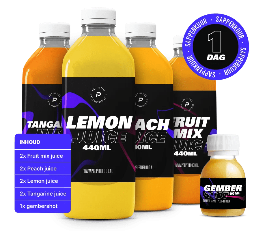 Even een reset? Deze sapkuur van 1 dag kan je hierbij helpen. Je krijgt in totaal 8 sapjes waarin genoeg mineralen en vitaminen zitten om de dag mee door te komen.