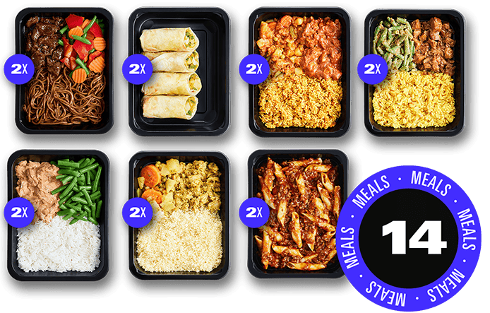 | Waardes per portie (gehele maaltijd) | Zoete Pulled Beef Eiernoedels Groentemix | Surinaamse Roti Rol Kip | Kip Tandoori Gele Rijst Groentemix | Kip Ketjap Gele Rijst Pittige Boontjes | Kipsate Rijst Sperziebonen | Marokkaanse Kip Couscous Groente | Pasta Bolognese |