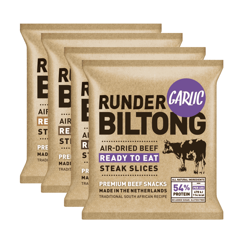 In dit Halal Biltong Mix Pakket proef je alle varianten: Garlic, Smokey BBQ, Spicy en Original. Een perfecte halal beef jerky vervanger – gemaakt van 100% halal rundvlees, zonder suiker of toevoegingen. Ideaal om jouw favoriet te ontdekken of om te delen als eiwitrijke snack.